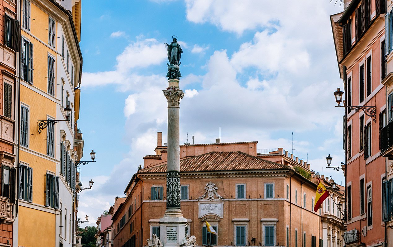 The Feast of the Immaculate Conception is an important religious holiday in Rome, marking the official beginning of the Christmas season. In Piazza Mignanelli near the Spanish Steps, a bronze statue of the Virgin Mary stands atop a tall marble column, and the day's tributes begin early as city firefighters place a floral wreath high on the monument. Throughout the day, pilgrims and worshippers gather to bring flowers, sing hymns and offer prayers, with the Pope and city officials visiting in the afternoon. Although a religious holiday, most shops remain open, and many Italians take the day to begin their Christmas shopping.